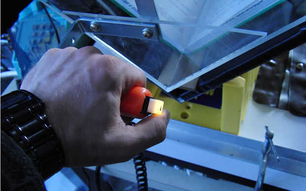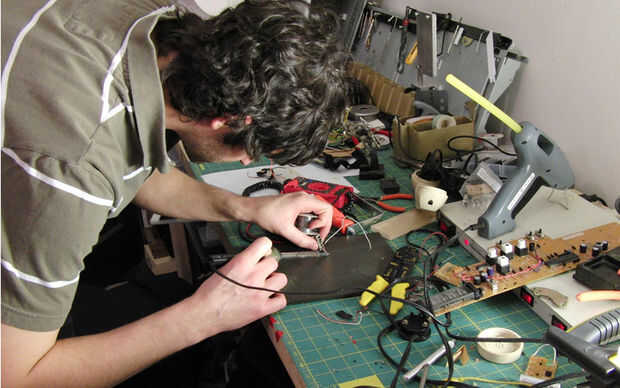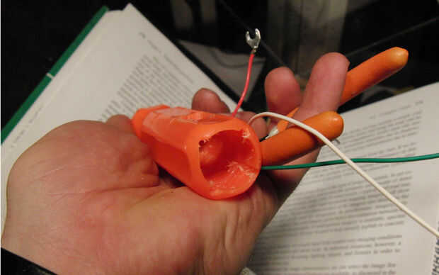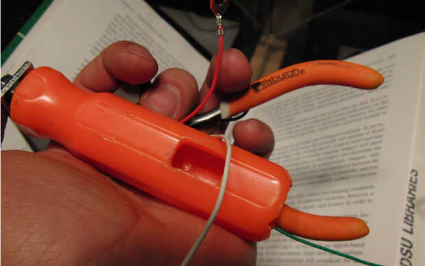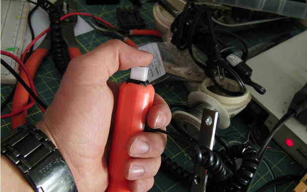 Consiste en el mismo eje del USB rescatado (pero con toda la electrónica que desoldar y el recinto y + V de cada enchufe del USB cableado a mano), una batería de 9V, un mango de destornillador y algunas viejas piezas del teléfono.
