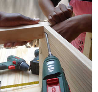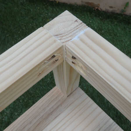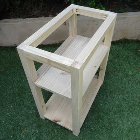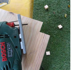 5. use una sierra de calar para recortar una sección de 44 x 44 mm en la esquina de cada uno de los estantes. Esto permite un ajuste perfecto entre las piernas y mantener las estanterías alineadas de arriba hacia abajo. Todos los estantes antes del montaje de la arena.