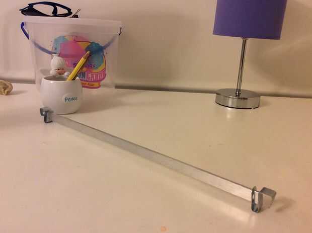 Una cosa de gancho de metal del cajón de archivo (mirar la cosa de metal en la foto, no sé como se llama) (si no tienes esto, usted puede simplemente cortar un resbalón resistente de papel o cinta o algo que puede sostener tazas)