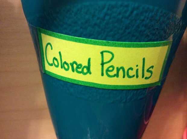 Cortar pequeños pedazos de papel y escribe cosas como, "Lápices de colores" y "Plumas" en ellos. Entonces ésos en las tazas de la cinta con cinta adhesiva fuerte