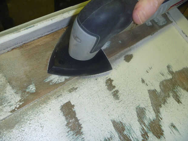Lije las superficies que se pintarán. Una lijadora oscilante hace el trabajo rápido de esto. Lija en mi pieza entera en menos de una hora. Lija en dos pasadas, la primera con 150 grano (gruesa) y la segunda vez con 220 lija (medio). También tomé un poco de pintura de las superficies que serían cubiertos en los espejos, sólo ser rigurosos.