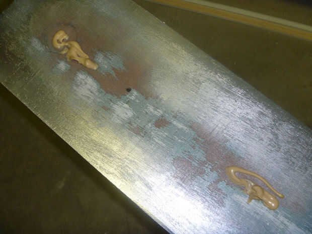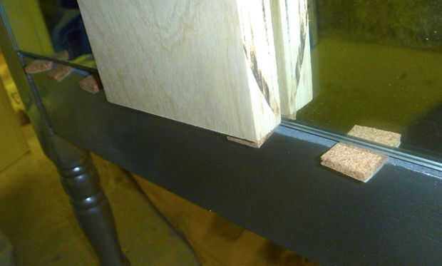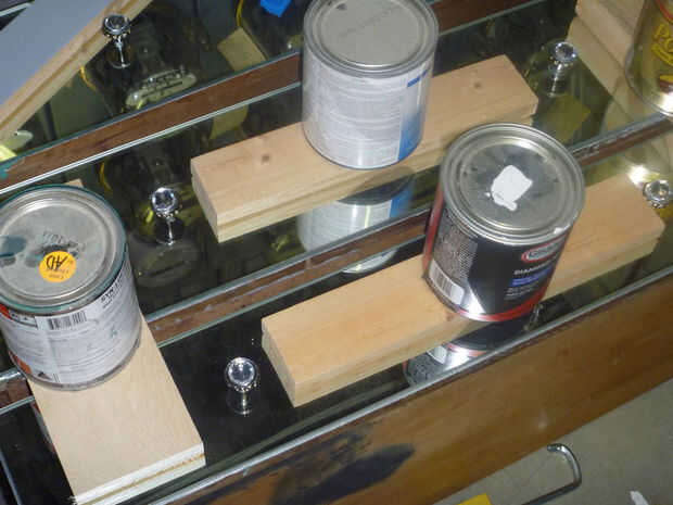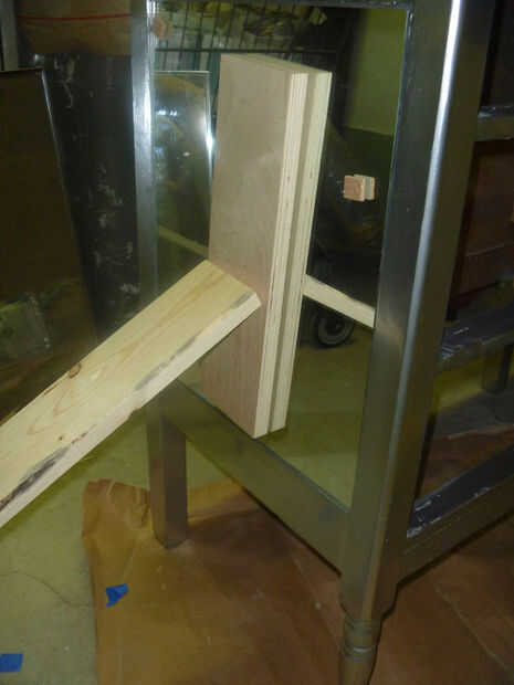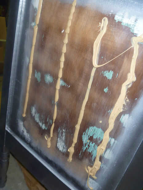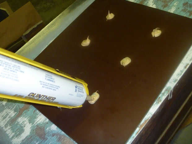Una vez la pintura esté completamente seca en su superficie, puede colocar espejos. Masilla de Gunther fue el adhesivo recomendado por mi tienda de vidrio. Lo que usted utiliza, asegúrese de que está formulado para usarse en espejo – algunos pegamentos pueden tira realmente el reflejo de la parte de atrás del vidrio. Aplicar toques sobre el diámetro de una cuarta parte, asegurándose de al menos 3" fuera de los bordes del espejo. Presione los retrovisores, agregar separadores en la parte inferior si es necesario y apoyo o peso mientras el masilla seca.