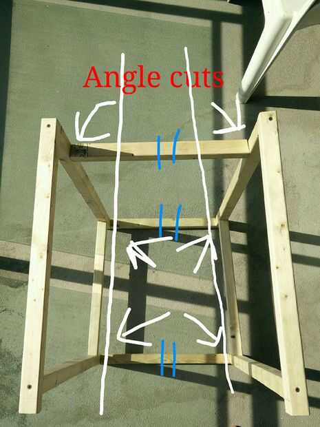 Porque los extremos de la 2-18" piezas y 1-20" pieza (marcado con líneas azules) tienen que cortarse en un ángulo ligero, usé un ángulo aproximadamente de 10°. Estaba usando una sierra de mano para cortar los bordes, por lo que no importa porque el corte no es muy preciso. Esto es más importante cuando utilizando un poder donde los cortes pueden ser más precisos.