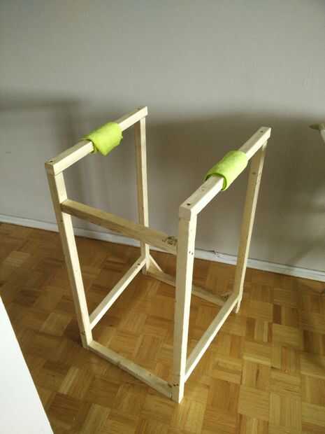 Usé un solo tornillo para sujetar las barras de la manija en su lugar. Yo les envuelve con algunos paños de lavado para hacer los agarres que funcionan bien.