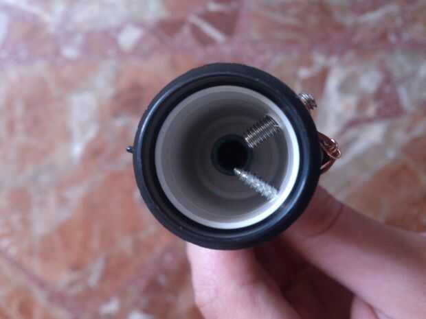 Cuando los cables están listos hacer dos orificios para insertar los dos tornillos que se conectarán a los cables del piezo, inserte los tornillos por lo que los puntos están cerca uno del otro y envuelven un alambre alrededor de ellos.