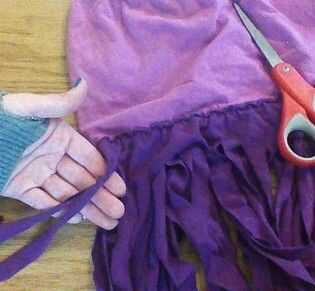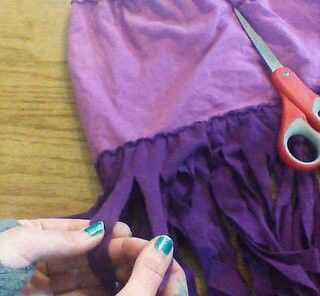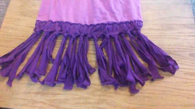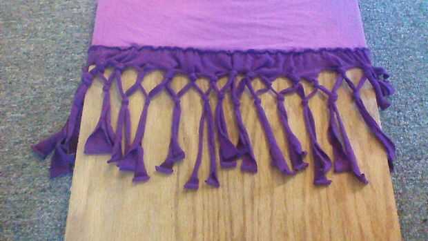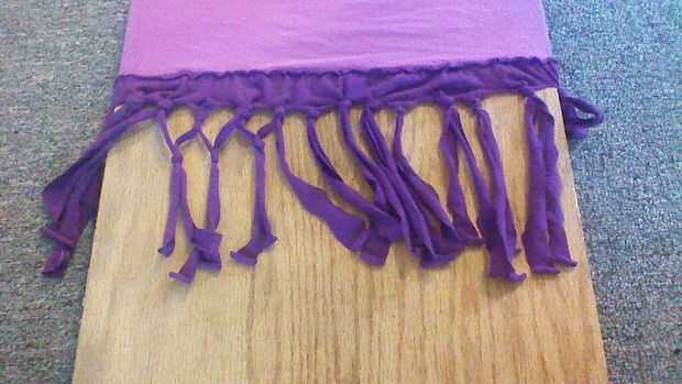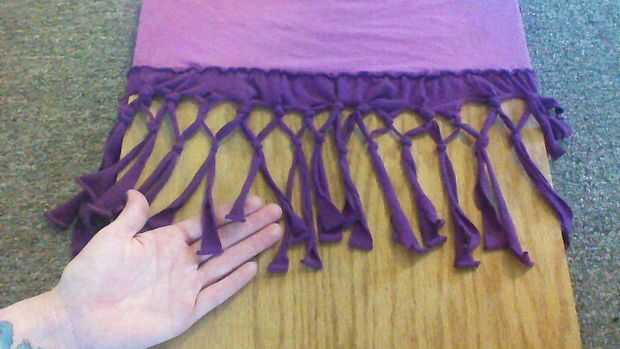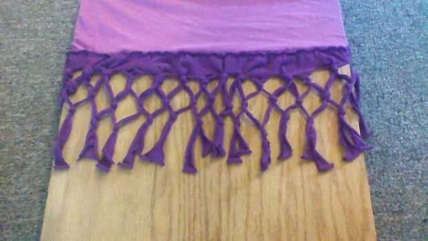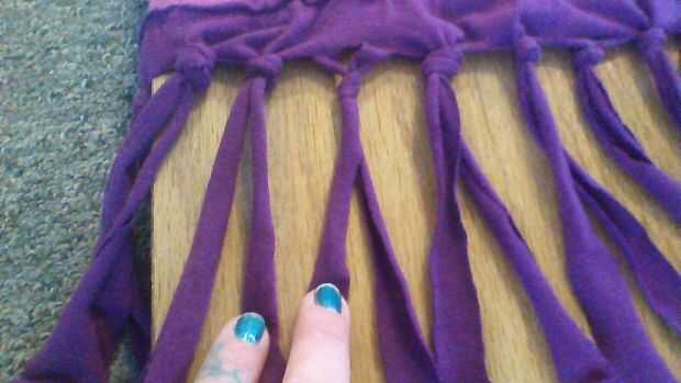 Para hacer más filas a repetir los pasos para hacer la 2ª fila de nudos. Hice tres filas con mi corte pero puede ajustar cuántas filas dependiendo de cómo mucho recortar a tela que tienes.