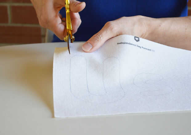 Comience por cortar los diseños preimpresos con una tela tijeras afiladas. Comenzamos con "USA", que irá en la bandera roja. (Puede que necesite utilizar un cuchillo X-ACTO para algunas de las letras.)