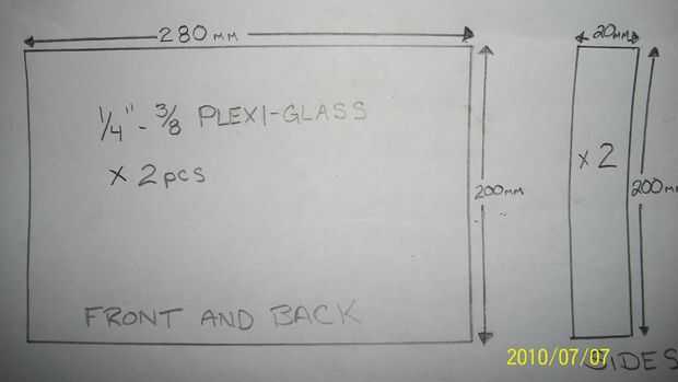 Corta el plexi-glass con el tamaño que desea hacer su depósito. Asegúrese de que corte los lados iguales fuera de diámetro como el PVC. El PVC va a estar el fondo del tanque tiene que ser un ajuste apretado! Decidí mantener mi relitivly tanque pequeño porque yo nunca grabe de PCB más de 5 pulgadas cuadrado todos modos. Una vez que tengas los 2 lados y el frontal y la parte posterior corte hecho el tubo de PVC a la longitud, corté mi PVC 3/4" más largo que la longitud del tanque para encajar en el cierre de la válvula y la válvula debe sentarse justo en el borde del lado de su tanque.