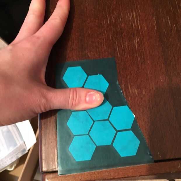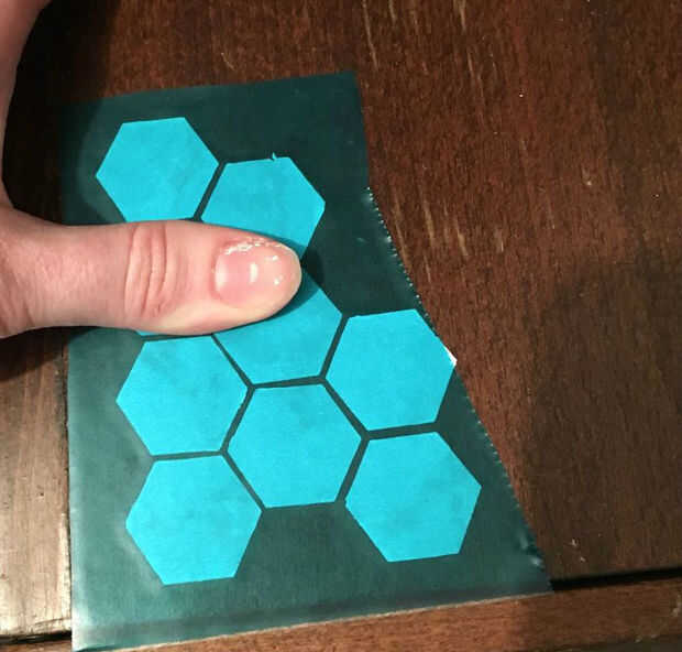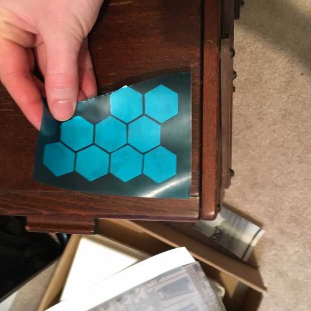 Coloqué mi etiqueta de hexágono sobre un pecho de coser que tengo en mi habitación con el propósito de este tutorial. Esto es solo porque tengo tatuajes en mi ordenador y el teléfono en el momento. Si está utilizando recortes de papel de contacto como yo, el papel de contacto pega metal, vidrio o superficies especialmente más fácilmente de lo que hace a las superficies ásperas (como este cofre de madera). No espero mi etiqueta en la foto aquí para durar muy largo porque el pecho de costura tiene una superficie áspera.