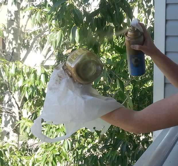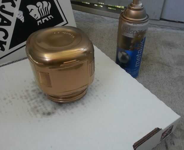 Si hubiera sido en casa para que este proceso habría puesto una lona abajo y aerosol pintado en el suelo, pero ya que lo hice en un apartamento de amigos tenía que sostenerla sobre la cornisa con una bolsa de basura por lo que no apago mi oro de brazo. Guantes probablemente sería útiles durante este paso... así como una máscara... Anywhooo, después de una rápida capa que puse en una caja de pizza que se seque durante aproximadamente cinco minutos. Lo más probable es que estaba seca después de un minuto pero yo quería estar seguro antes de tocarla. Mi primera vez haciendo este proyecto que usé algunos restos pintura orange/tan que tenía alrededor pero tuvo dos capas para que quede bien y pintura de aerosol fue mucho más rápida.
