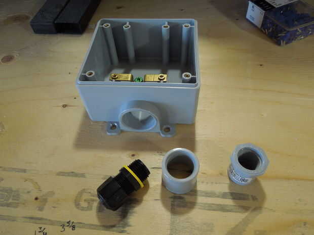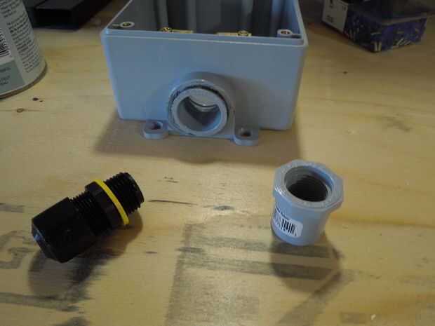 El segundo manguito va con pegamento de PVC conduit y reduce el orificio de 3/4 de pulgada hasta una rosca hembra de 1/2 pulgada.