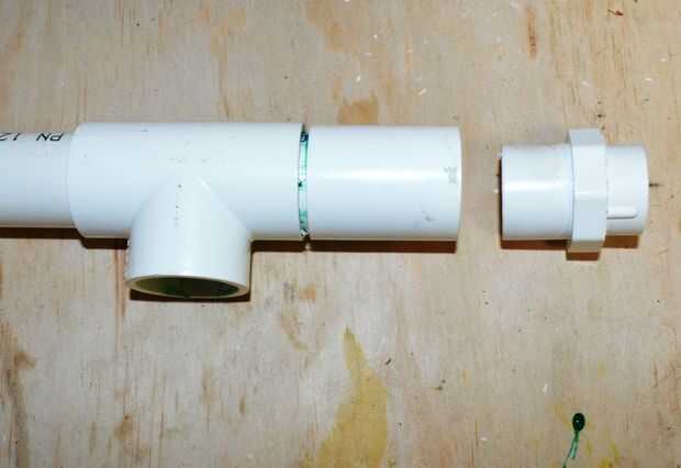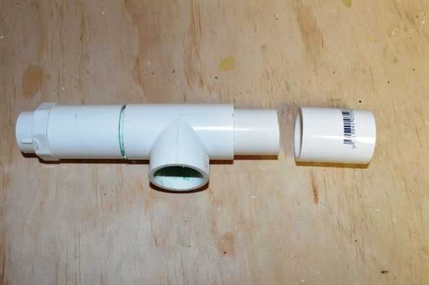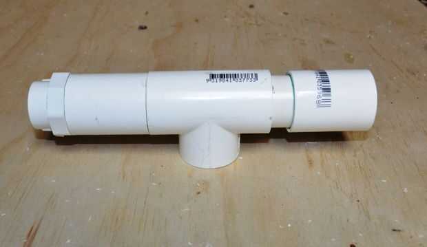 1. pegamento en su lugar los acoplamientos 2 X 25mm en los extremos de la tubería de 25mm, el acoplamiento frontal debe quedar al ras con la sección de T. Recortar el tubo de 25mm si es necesario. El otro acoplamiento (uno que entrará la bomba) debe quedar unos 10mm de la sección de T. Esto permitirá un poco más de presión en la cámara de aire.