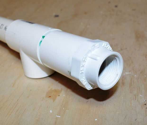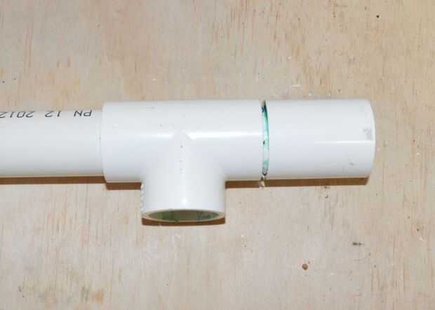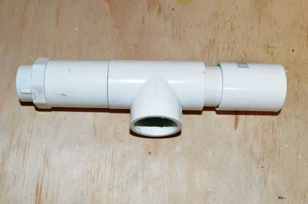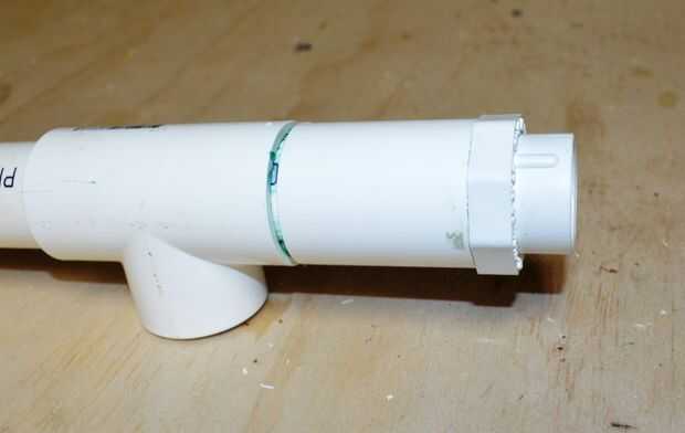 3. Agregue algunas más tuberías de 25mm en la parte inferior de la sección de T. Se trata de su mango. Hacer el mango un poco más de lo necesario como equilibra el arma terminado. No tis del pegamento en su lugar, sólo está agregando esto en el momento de la pintura. Por último, presione en el extremo de 25mm en la parte inferior del mango.