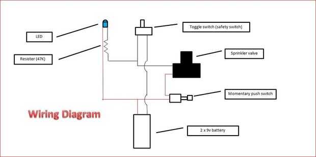 Luego necesitas alambre para la válvula del aspersor a la batería y empuje el interruptor. Inicialmente me iba a agregar un interruptor de seguridad y había perforado todos los agujeros pero encontró que no cabe por la batería. Dejé el esquema por si alguien quiere agregar uno.