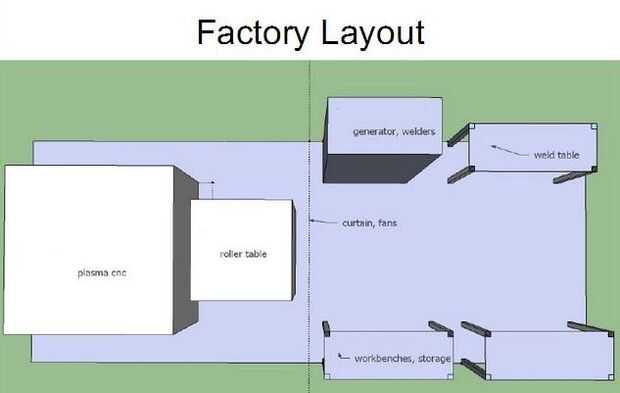 - Tamaño de materiales: que se va procesando: no vas a ser feliz tratando de mover un 4' gran pedazo de metal en un recipiente que tiene exactamente 4' espacio sin obstáculos entre las puertas y su destino. Encontramos esto mediante la implementación de más o menos lo que se ve en 'layout de fábrica' abajo: 'generador, soldadores' y 'mesa de soldar' fueron trasladados fuera después de media hora de intentar trabajar con este diseño.