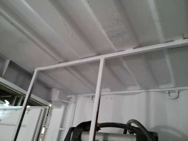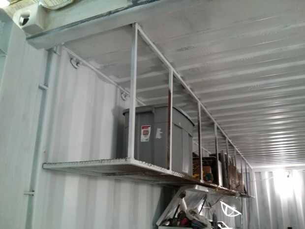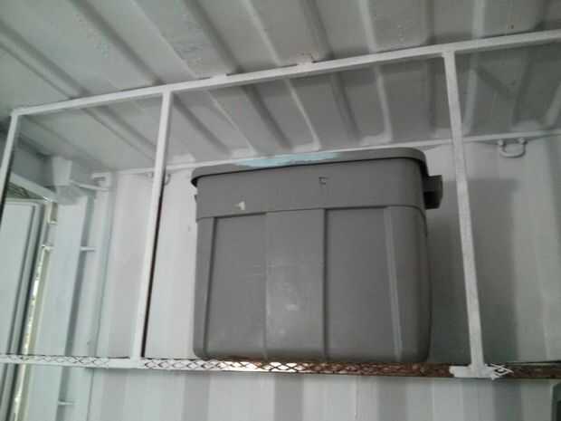 Por suerte, contenedores de transporte son altos y los envases de almacenaje durable son baratos. He creado la estantería por soldadura 3/4" tubo en un largo 'L', cubriendo la base con metal desplegado y esto de la soldadura directamente a la pared y techo del contenedor (arena a través de la pintura en primer lugar, no respirar este material probablemente desagradable de plomo).