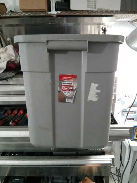 Los contenedores son rubbermaid roughneck de 18 galones, mide 23,9" L x 15,9" W x 16,5 "H. La estantería mide ~ 25" L x 17,5" W (para pared del envase) x 24 "H por cámara, con 2 estantes más pequeños en el extremo. Total útil longitud es ~ 18'8 ".