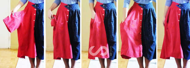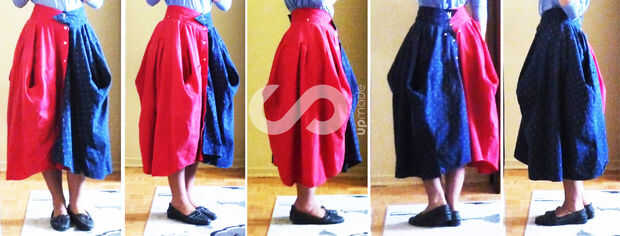 No tengo una foto de este, pero también puedes usar la falda con las piezas de abotonado abajo a los lados, para que tenga un color en la espalda y el otro en la parte delantera.