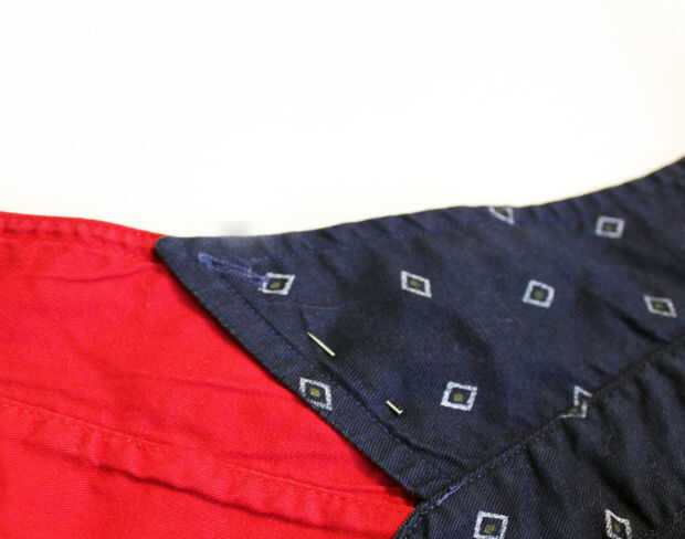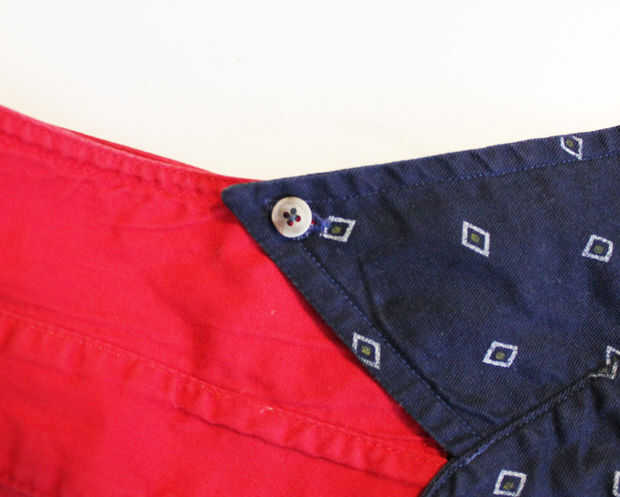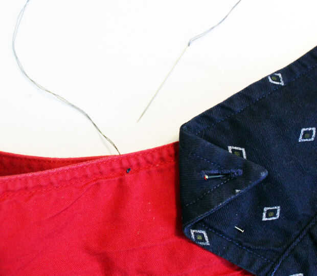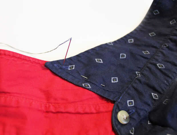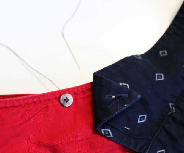 + En mi caso, tengo que coser un botón en la camisa roja para que pueda utilizar el ojal de la camisa de color azul marino. Me aseguraré de que el botón que usar es también de la camisa de color azul marino, y específicamente uno significó para ese agujero de botón. Yo puedo doblar el cuello hacia abajo de la manera que ha significado para sentarse y ver qué botón ojal alinee con. Cortar.