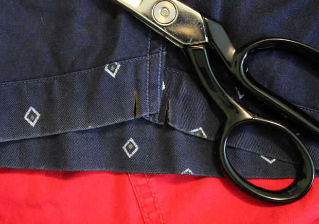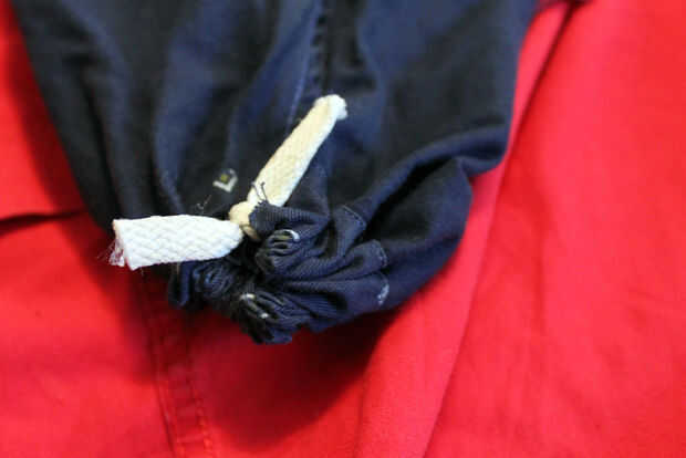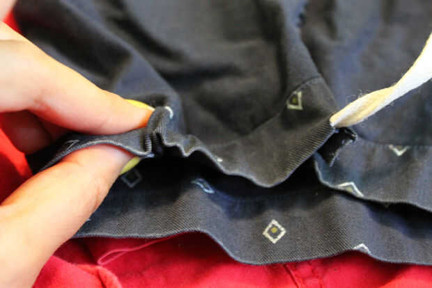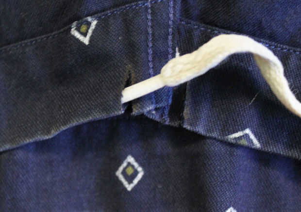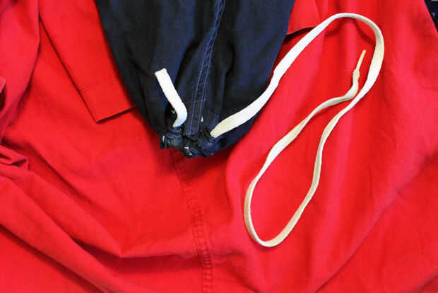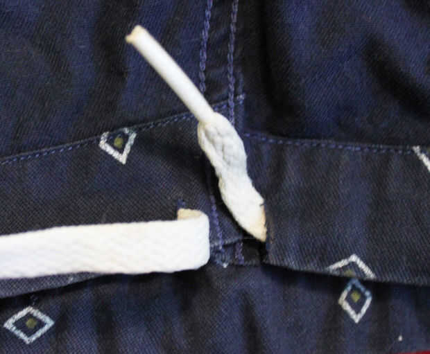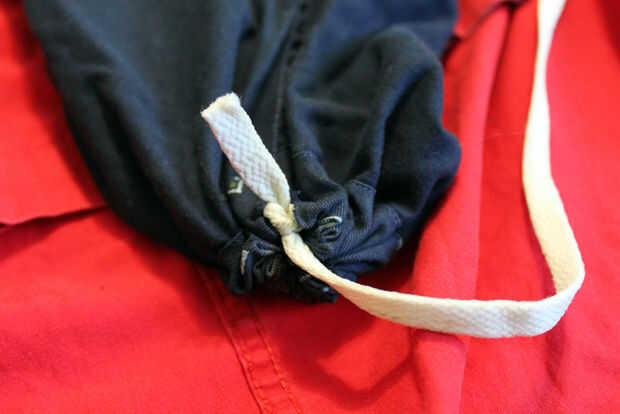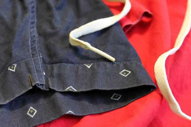 Los cortes sólo tienen que ser lo suficientemente grande como para manejar el cordón (o material de la opción) a través del canal de tela que ya está allí. Cordones de los zapatos funciona perfectamente porque tiene una punta sólida que es fácil sentir bajo la tela como estoy tirando del mismo.