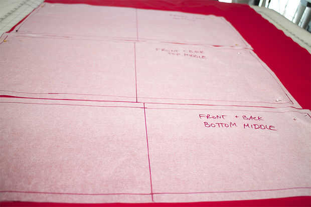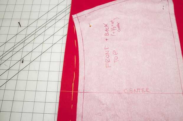 PIN o peso de las piezas del patrón a la tela, usando las líneas centrales de la línea de grano. Ejecute la línea de grano paralelo al orillo de la tela.