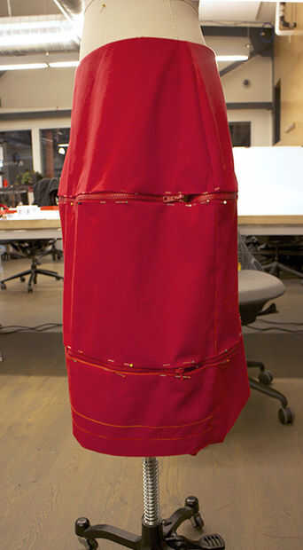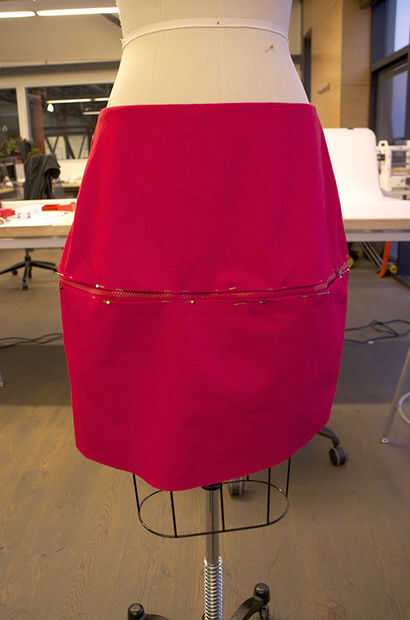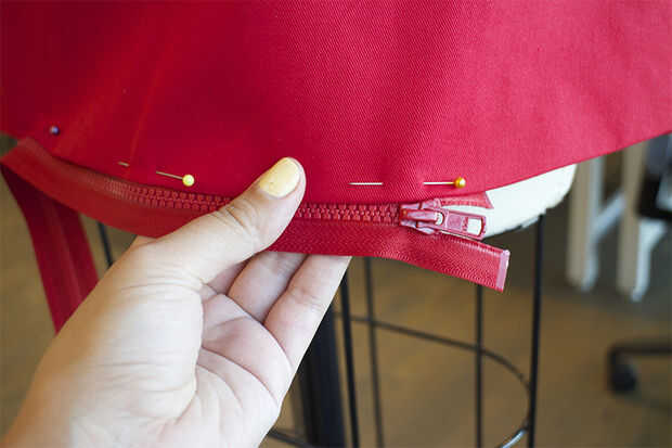 -Comenzar fijando un lado de la cremallera a la pieza superior de la falda. Después se cubrió bien y uniformemente, tomar la pieza superior medio y fijar el borde doblado, acabado al otro lado de la cremallera. Asegúrese de que alinean las costuras laterales de las dos piezas. PIN todo alrededor.