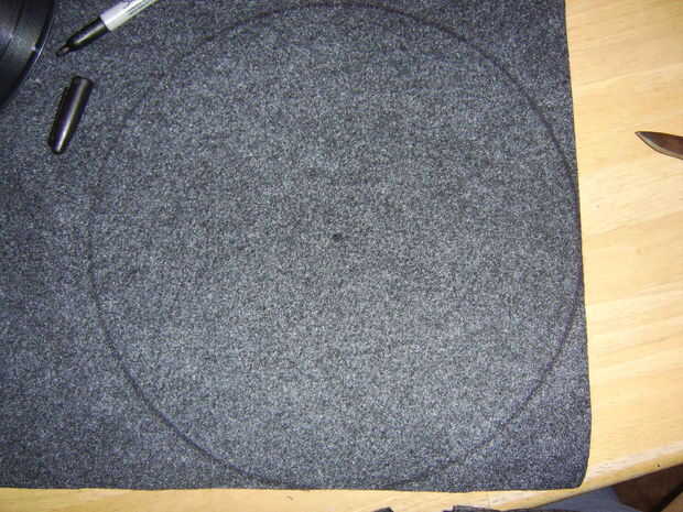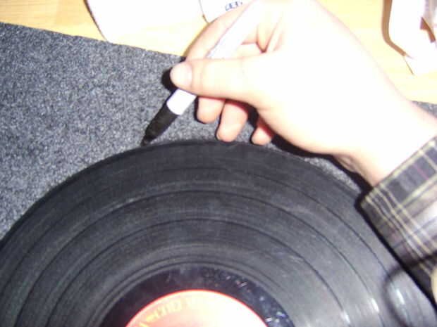 Tomar el registro y poner sobre el fieltro, traza la circunferencia de la LP. Mientras sostiene el LP en posición, claramente marca el agujero del huso en el fieltro