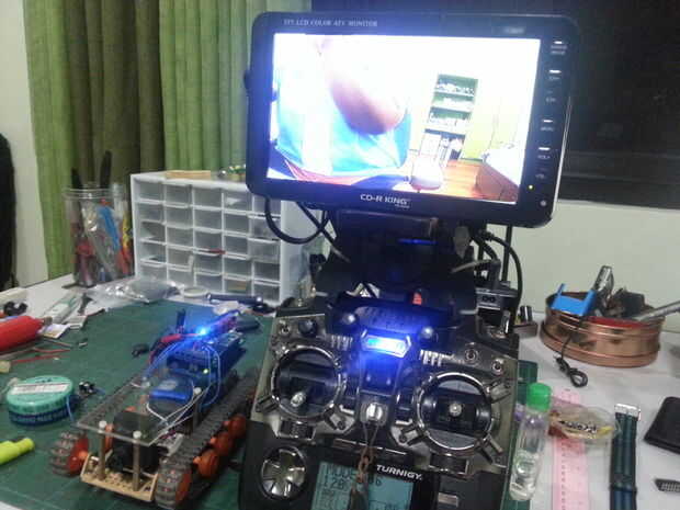 El uno en el roverbot se llama FPV transmisor y cámara, y la otra en su mano se llama el receptor de la FPV. El receptor se conecta a cualquier TV puede ser una TV de LCD, TFT etc.. Todo lo que realmente tienes que hacer es suministrar con 12V utilizando una batería o fuente de alimentación externa. Activar y cambiar el canal en el receptor FPV si es necesario. Después de ahora podrá ver visual de lo que ve usted su roverbot