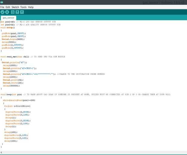 int pin1=A0; // MQ-6 LPG GAS SENSOR OUTPUT PIN int pin2=A1; // MQ-2 AIR QUALITY SENSOR OUTPUT PIN int trigger1=400; //AT WHAT SENSOR OUTPUT VOLTAGE VALUE LPG ALARM WILL BE TRIGGERED int trigger2=400; //AT WHAT SENSOR OUTPUT VOLTAGE VALUE SMOKE ALARM WILL BE TRIGGERED void setup() { pinMode(pin1,INPUT); pinMode(pin2,INPUT); Serial.begin(9600); delay(5000); pinMode(2,OUTPUT); pinMode(3,OUTPUT); } void send_sms(char ch[]) // TO SEND SMS VIA GSM MODULE { Serial.println("AT"); delay(1000); Serial.println("AT+CMGF=1"); delay(1000); Serial.println("AT+CMGS=\"+91**********\""); //CHANGE TO THE DESTINATION PHONE NUMBER delay(1000); Serial.print(ch); Serial.write(26); delay(300000); } void beep(int pin) // TO WARN ABOUT GAS LEAK IF SOMEONE IS PRESENT AT HOME, BUZZER MUST { //BE CONNECTED AT PIN 2 AND 3 OR CHANGE THEM AT YOUR WILL while(analogRead(pin)>=200) { for(int i=0;i<100;i++) { digitalWrite(2,HIGH); digitalWrite(3,LOW); delay(1); digitalWrite(3,HIGH); digitalWrite(2,LOW); delay(1); } delay(100); digitalWrite(2,LOW); digitalWrite(3,LOW); delay(100); } } void loop() { char ch1[]="Attention! Gas leakage at Home! Attention!"; //DIFFERENT MESSAGE IN DIFFERENT CASES char ch2[]="Attention! Thick smoke detected at Home! Attention!"; int sensor1 = analogRead(pin1); int sensor2 = analogRead(pin2); if(sensor1>=trigger1) //IN CASE LPG/COOKING GAS LEAKAGE IS DETECTED { beep(pin1); send_sms(ch1); } else if(sensor2>=trigger2) // IN CASE SMOKE IS DETECTED { beep(pin2); send_sms(ch2); } } He escrito el código en parte y funciona en caso de que quiera cambiar algo de ella o añadir algunos extras para la expansión.