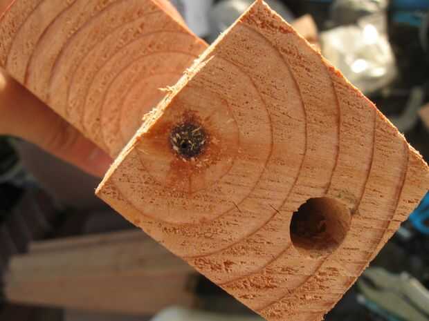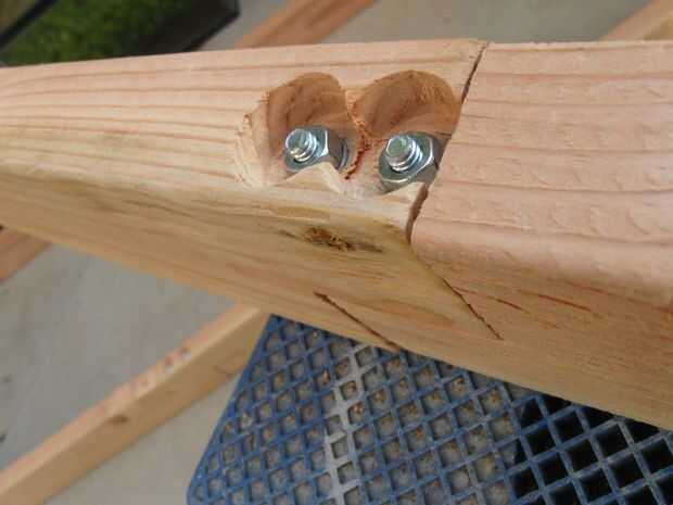 -Taladre un agujero profundo de 1.5" en la intersección. Use una broca apropiada para la tuerca cilíndrica. Mina eran 13mm de ancho. Estos agujeros deben reunirse con los otros agujeros que ha perforado.