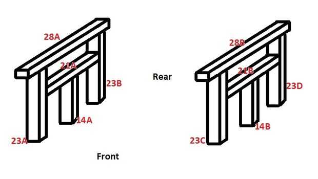 -Poner todo junto. Coloque las espigas en sus mortices correspondientes. Asegúrese de que los orificios de 21G y 21J están mirando hacia afuera.