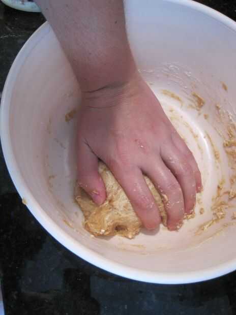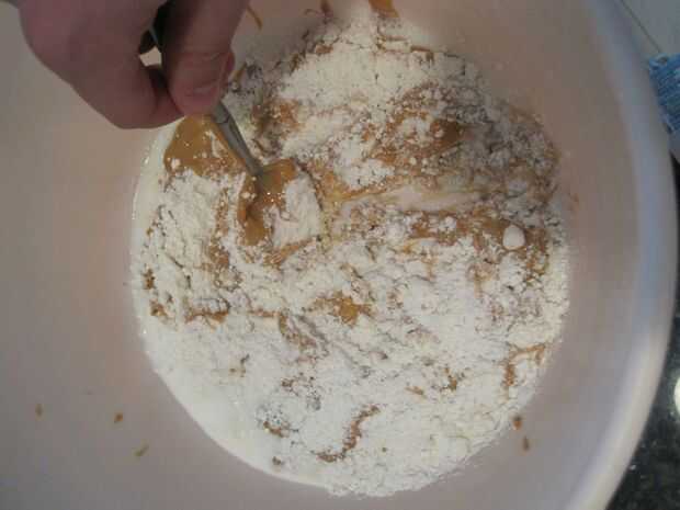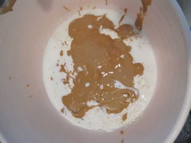 Mientras el horno se está calentando, empezar por mezcla el Bisquick y la leche en un tazón grande. Sólo puede añadir la mantequilla de maní, pero Hazte un favor y fuera su medida mantequilla de cacahuete en el microondas durante 30 segundos o hasta que esté líquida y pegajosa. Hacer esto hará que mezcla mucho más fácil. Una vez su caliente, mezcle bien con los demás ingredientes. Medida que uno mezcla, debe empezar a adquirir una consistencia pastosa. Para dar a la masa un poco de volumen, amasar un par de veces. Ahora está listo para cortar las galletas.