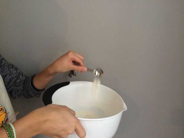 Poner la harina y la levadura en un medio de tamaño de recipiente y bate suavemente para combinar.