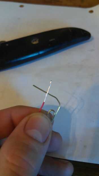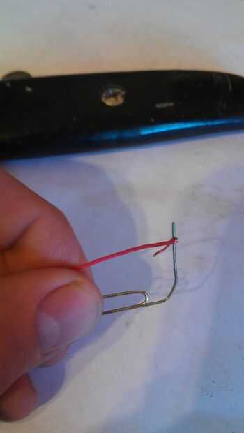 Tira de aproximadamente 3/4" de aislamiento el cable de núcleo sólido. Revela el clip de papel ligeramente, alicate para sujetar el alambre contra el clip y con cuidado enrolle dos vueltas más o menos alrededor del alambre de clip de papel. Finalmente, corte el alambre sobrante y la parte recta 90 grados, dejándole listo para el uso con uno de los extremos de la curva. Ahora hacerlo una segunda vez en el otro extremo del cable.