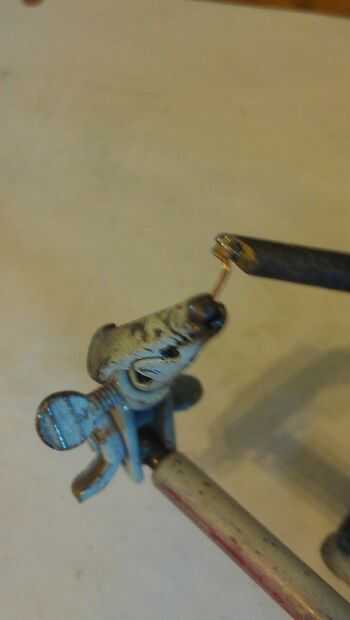 Tira de 3/8" de alambre trenzado, calientan el final otra vez e Inserte el cable trenzado en la bobina. Empuje que hace que el aislamiento en contacto con la bobina y ablanda, y luego retire el soldador y dejar enfriar. Doblar el alambre trenzado extra que en sí mismo.