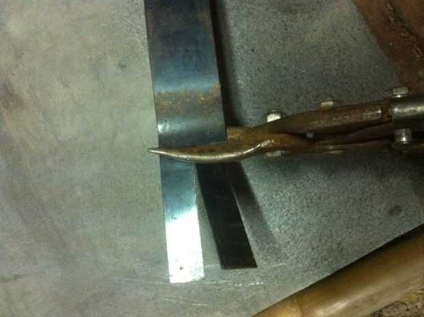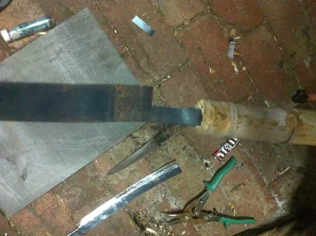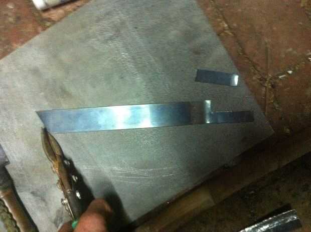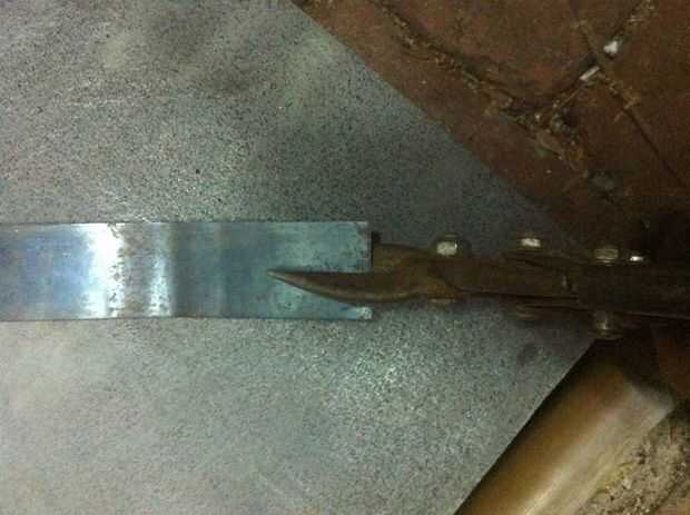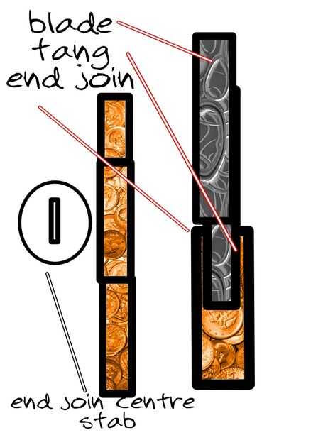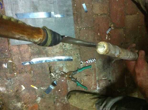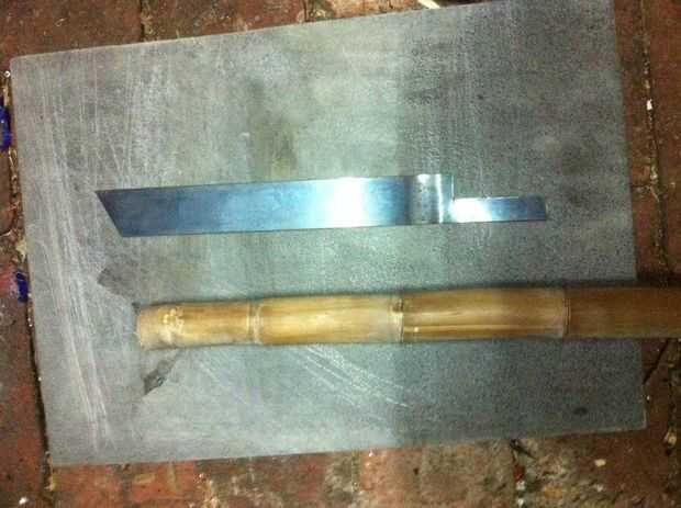 Acero del resorte de corte demasiado tamaño. una hoja larga de pie necesita una espiga por lo menos medio pie largo. Marque tamaño de espiga y corte primavera acero el centro cortar un lado de tang. Esta espiga irá dentro de la Unión final de bambú apuñalada antes.