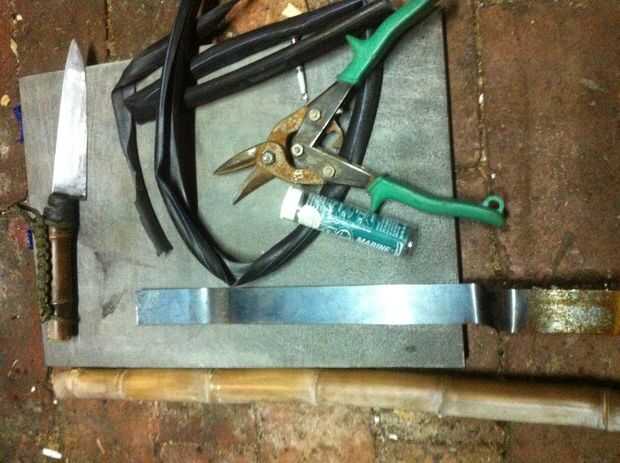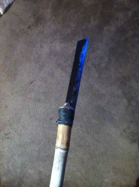 Una vez está afilada hoja de acero del resorte, inserte el extremo de la espiga de la hoja de en bambú. debe ser un ajuste apretado. no fuerza la cuchilla en la mano de vy de bambo en cambio aprovechar el bambú en el suelo con lámina ontop y vertical la gravedad y fuerza obligará a cuchilla en bambú mucho más fuerte que con la mano. una vez tang todo es dentro de bambú siguen tocando hasta la lámina comienza a penetrar en bambú. 1/2 pulgadas de hoja en bambú es suficiente. la hoja y bambú ahora se han convertido en uno y no debe moverse. Cortar cámara de bici por la mitad y envolver firmemente alrededor de bambú cerca de extremo de la hoja. Esto comprimirá bambú con el tiempo y ayudar a bloquear en la hoja. Mezcle la resina de epoxy y palillo en bambú y hoja final se unen. Esto asegurará la lámina y el bambú son siempre uno.