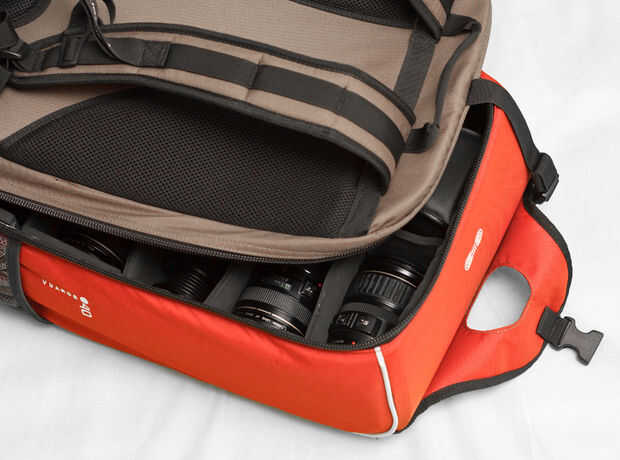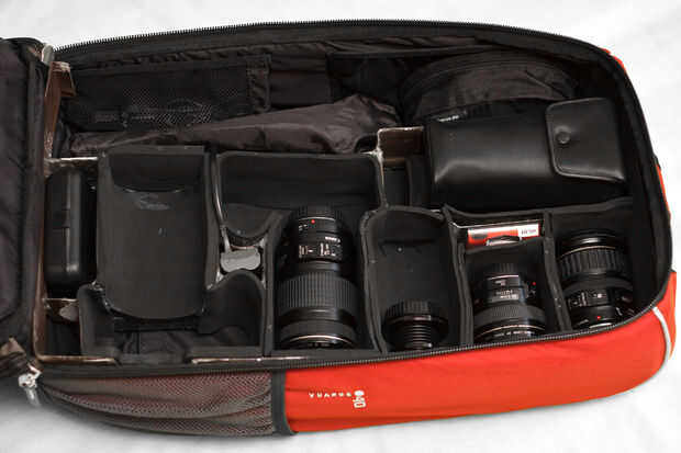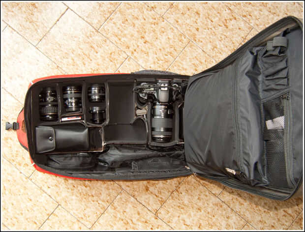 Aquí puedes ver la mochila con un cuerpo de cámara 40D, cuatro lentes de Canon, un lensbaby, dos flashes de Canon, un Mini trípode, mi equipo motorizada gigapan, mi fuente de alimentación de la batería, un filtro IR, un mando a distancia (en el bolsillo neto) y hay un montón de espacio para un segundo cuerpo y otras herramientas.