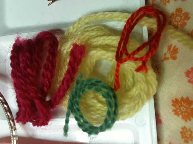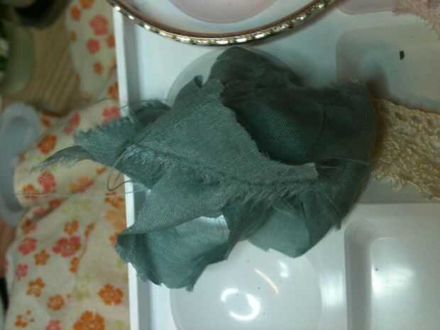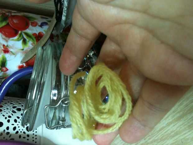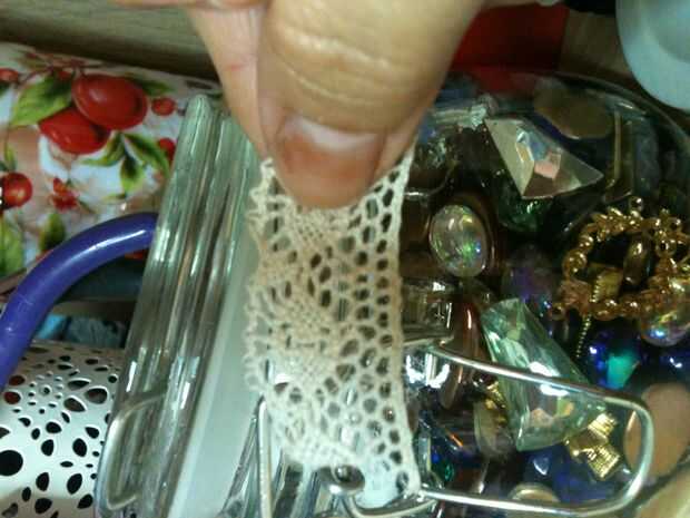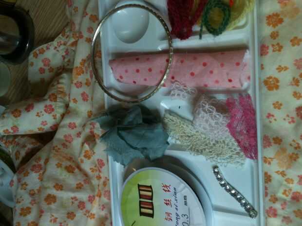En esta foto verás algunas de las cosas que usted necesita. Mantener el desplazamiento a través de fotos y podrás ver más de las cosas que necesitarás. Aquí ver alambre de 0,3, cadena del rhinestone, retazos de tela, algunos trozos de encaje y algunos restos de hilo y una pulsera de metal barata