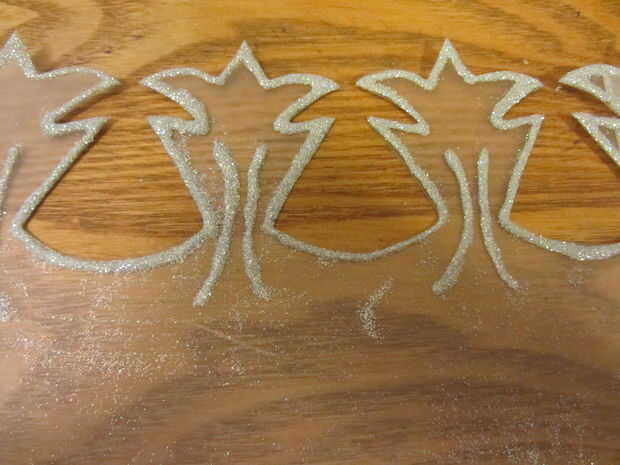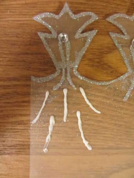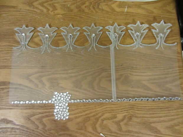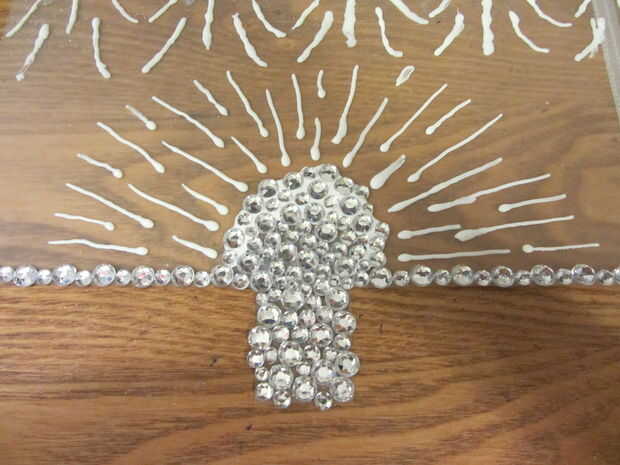 Se describe cada uno de los puntos de pegamento y me agrega brillo. Después de añadí rhinestones a la pieza de frente y uno a cada punto. He añadido rhinestones esporádicamente para el resto de la corona y la parte inferior entera de la corona. Entonces, hice líneas diagonales como los que en la corona real. Después de que tuve todos los rhinestones adjuntados y todas las líneas dibujadas en el pegamento pegajoso, salpicado brillo en toda la corona.