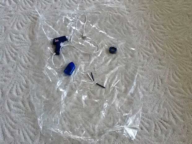 1 - gran bolsa de plástico (yo usé una bolsa de la tintorería) Velas de cumpleaños de 3-4 Alambre 1 de espesor y resistente 1-aluminio Pistola de pegamento 1 1-encendedor