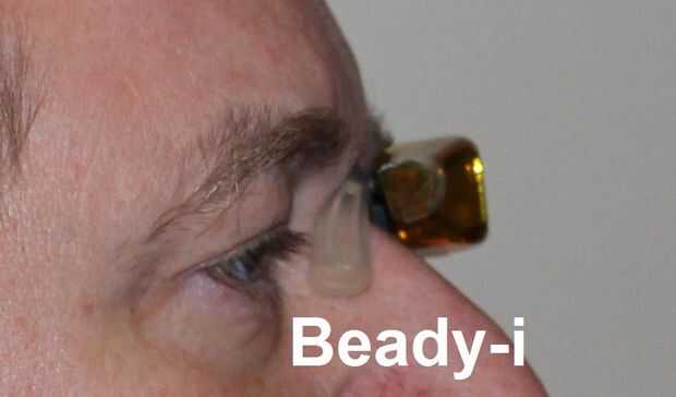 a) no integrado en un par de gafas. En su lugar tenemos un puente de la nariz para localizar a un extremo y una correa elástica funciona alrededor de la parte posterior de la cabeza a una pequeña almohadilla debajo de la oreja en el lado opuesto. Esta disposición está inspirada en una versión reciente del concepto del ojo del grifo (que también originalmente un tipo de gafas de marco).
