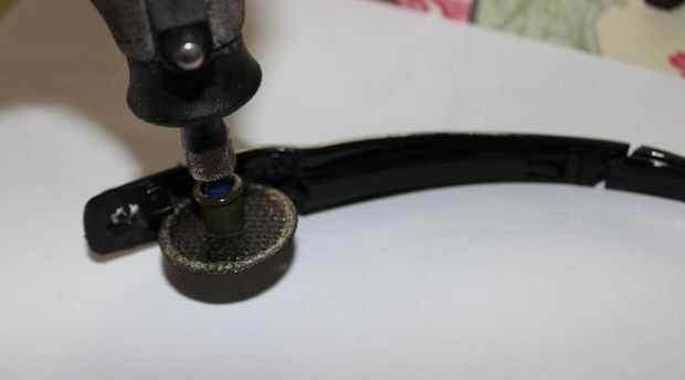 Ahora queremos hacer una ranura o zócalo en que le pegamento/perno final acortado del brazo lateral de las gafas de vídeo.