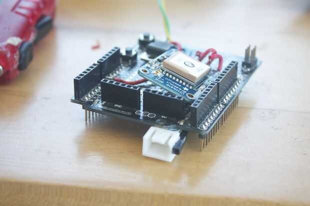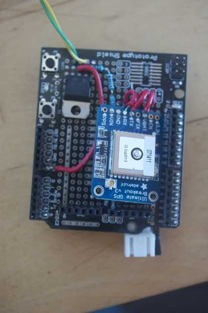 El último desglose GPS de adafruit funciona bien esta aplicación. No podía ser más fácil enganchar para arriba. Encontrar un buen lugar para él en su pro escudo y luego sólo tiene que conectar el Vin a 5V, GND a GND, Rx digital 9 y Tx a digital 8.