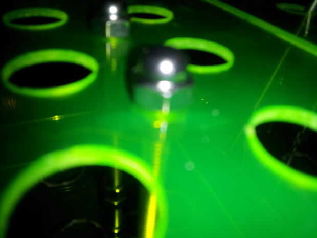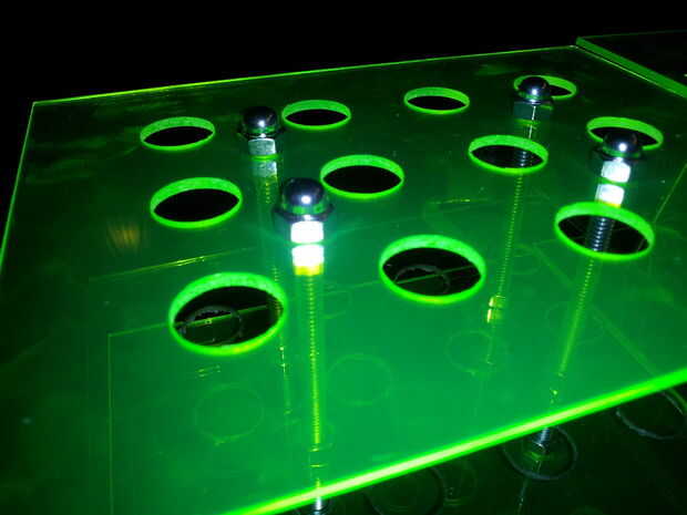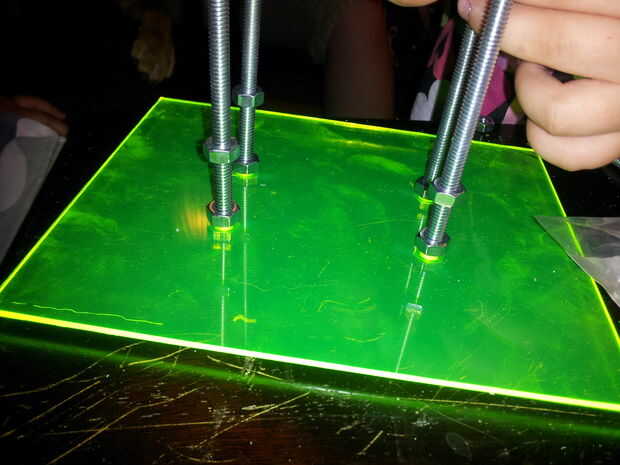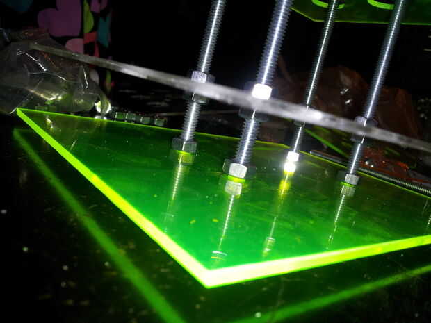 La Asamblea... Esto es realmente bastante fácil. Comience con la capa inferior y alimentar sus pernos de la parte inferior. Tomar tus tuercas y apriete hacia abajo, sosteniendo la capa inferior en su lugar. Tomar otro conjunto de tuercas y tornillos en posición. Si tienes algo para que coincida con su altura a través de todos ellos, es aún mejor. Ahora deslice su segunda capa de plexi de y apriete con otro conjunto de pernos. Finalmente, tomar otra serie de tuercas y les tornillo encima tal vez una media pulgada más o menos, usted no necesita ser más exactos con estos porque vas volviendo a ellos. Tomar la capa superior y ponerlo en su lugar. Luego atornille las tuercas de sus acabadas. Elegí una tuerca de la bellota. Tiene un aspecto limpio y tapas bien la parte superior del perno. Ahora toma el último conjunto de tuercas normales y apriete ese pedazo superior de plexi para las tuercas de acabado finales.
