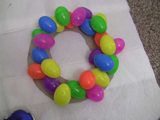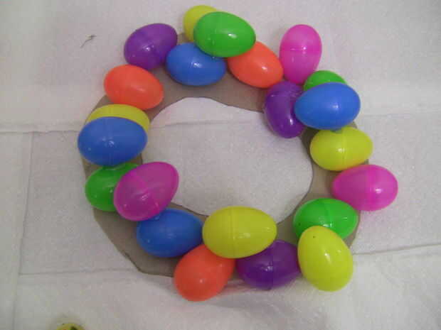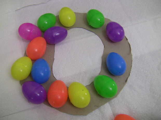 Continuar pegando los huevos plástico sobre el círculo de cartón hasta más el círculo se cubre con los huevos.