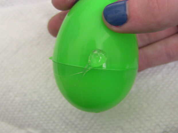 Una vez que esté caliente la pistola de pegamento caliente pone un palillo del pegamento en él y toma un huevo de plástico y simplemente pega el huevo de plástico a la cartulina.