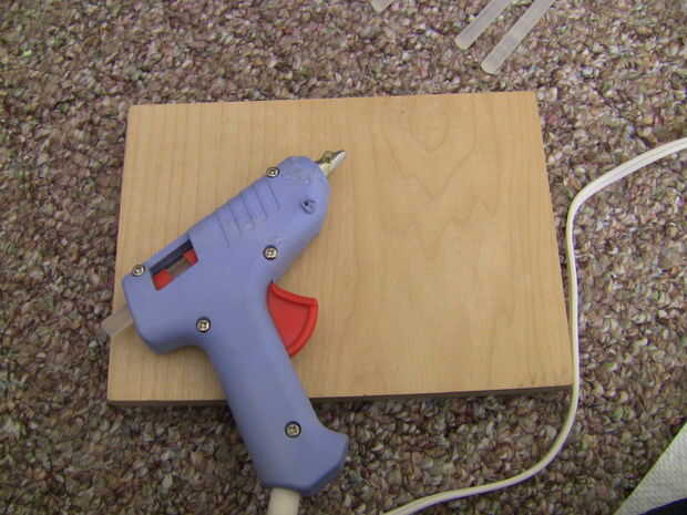 Conecte la pistola de pegamento caliente y ponga la pistola de pegamento en el pedazo de madera y deje que se caliente.