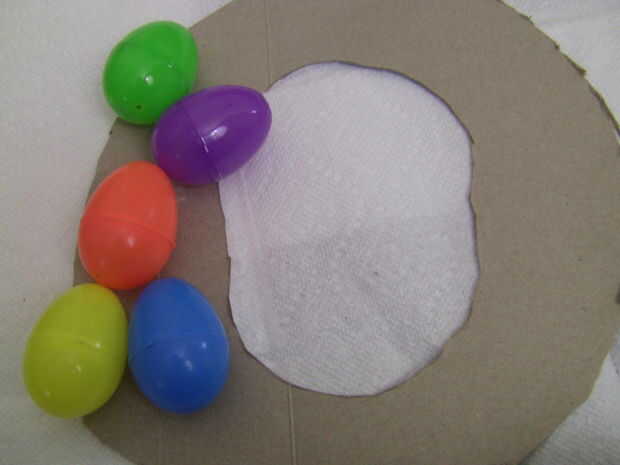 Use sus tijeras para cortar pequeños trozos del círculo de cartón por lo que parece los huevos están completamente cubiertas la cartulina. Debe buscar como no volver a los huevos cuando realmente no existe.