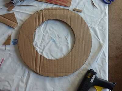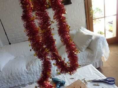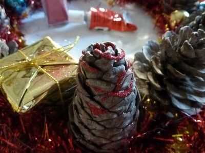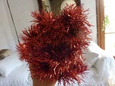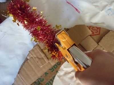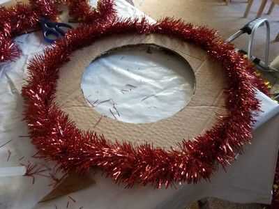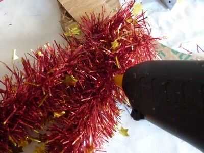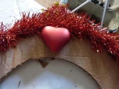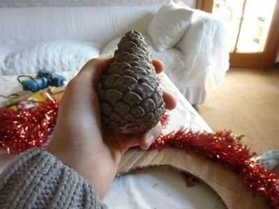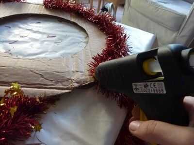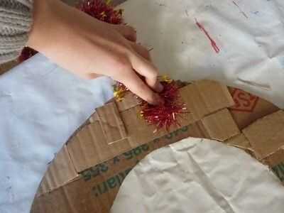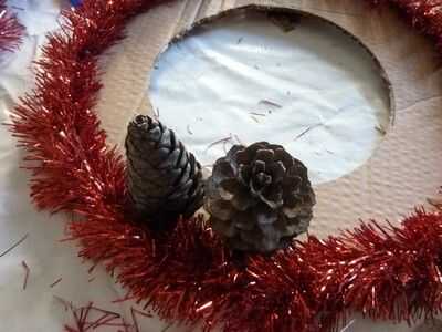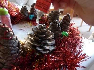 We have the base, but... we need to put something on it! Primero lo básico un fuerte alambre/malla en la parte posterior de la base, así nos podemos colgar. Es mucho más difícil de la grapa después de que todo lo tenemos en nuestra base. Girar a derecha para arriba y una malla. Prefiero los más delgados, pero alguna es aceptable. Pegar alrededor de su base. Si usted quiere, usted puede pegar uno en el exterior y en el interior, pero solo pegar uno en el exterior y luego hacer algunos toques mágicos. ;) Después de pegar su oropel/s alrededor del borde/s, es hora de conseguir sus piñas y adornos de árbol! Desea obtener un cono de pino y poner pegamento con la pistola de pegamento en la parte flat-ish de la parte inferior, y poner mucho, así que se peguen mejor. Puedes poner un adorno en la parte superior de su corona, como un pequeño adorno de Santa. No tengo ninguna izquierda, usé sólo un corazón. Puse algunas bolas bolas entre los conos de pino, y para pegarlas, desea que tire de la broca de metal en la parte superior y sustituir con pegamento. Cubra el área alrededor de él con pegamento, también y entonces en el cartón. Continuar así hasta que su base esté llena. Pero verás que hay algunos lugares donde se puede ver la cartulina. No hay que preocuparse, sin embargo, tenemos una solución. Poner pegamento de su pistola o pegamento normal, aunque tiene mejor pegamento pistola de pegamento, donde se puede ver la cartulina. Pegar pedazos de malla donde pusiste el pegamento. Ta-da! Pero todavía no estamos acabados... Hay un ingrediente secreto... BRILLO! Necesita mantener su cola normal sobre el cono de pino y mientras que apretar, Remolino alrededor sobre el cono de pino. Luego agitar su "coctelera de brillo" sobre él. Cuando hayas terminado agitando la coctelera de brillo, soplar en el cono de pino para deshacerse de cualquier exceso brillo. Hacer todos tus conos de pino, o como muchos como usted desea, como esta, y puede utilizar diferentes colores o un color. O no brillo en absoluto. Ahora, estamos listos. Pero usted todavía necesita para ponerlo en su puerta, y si no quiere poner un clavo en la puerta, yo estoy aquí para ofrecer otra técnica.